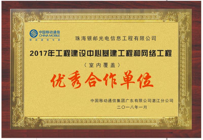 2018年1月荣获湛江移动“优秀合作单位“
